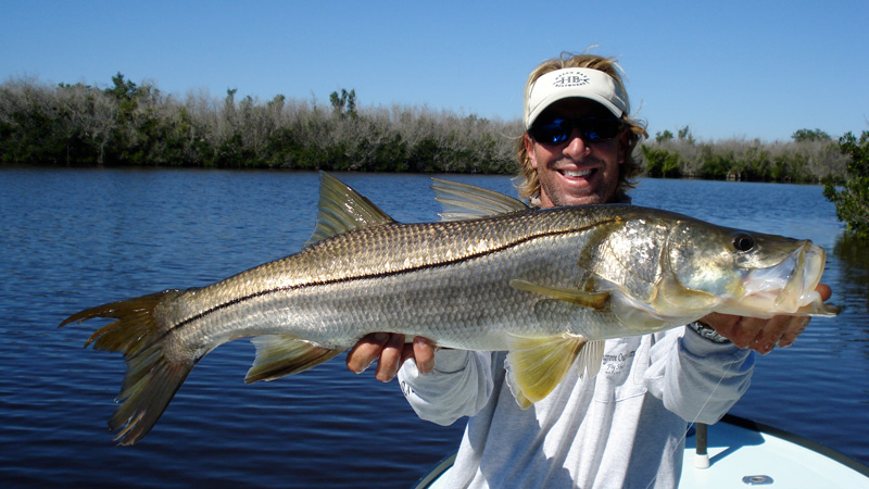 Captain Jeff Legutki holds a beautiful everglades snook he caught on fly